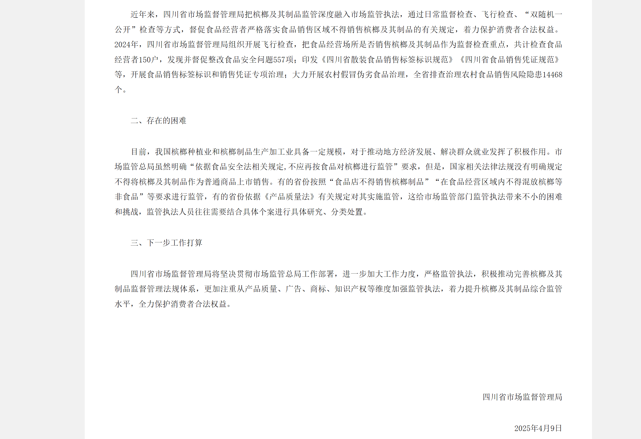 正在四川市场监管局的回答函中,当天,全省已完全堵截槟榔做为食物的出产渠道。成为全国最严酷的监管案例。宁乡市一家槟榔点,